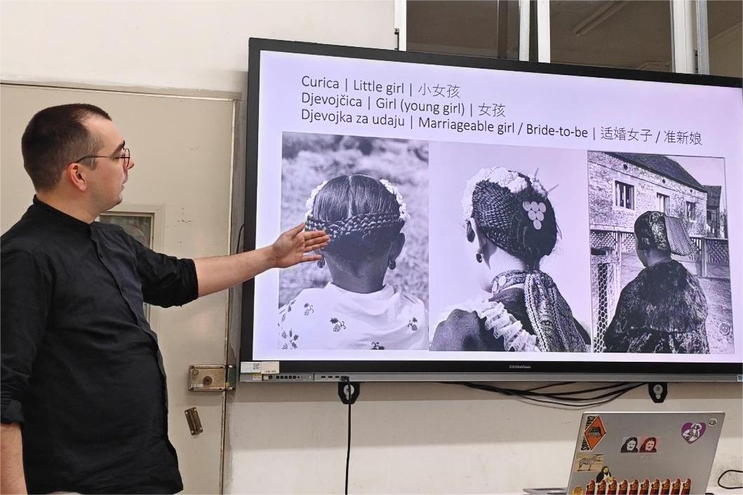首场工作坊讲座以“克罗地亚东部的传统发型”为题,利瓦亚先生深入剖析了发型在克罗地亚社会中的文化意义,展示了适用于不同年龄与场合的多种传统女性发型,介绍其历史渊源、代际传承及其在民俗活动中的重要作用。讲座后,学生们通过教具学习了基础编辫技巧,亲手体验传统发式的魅力。