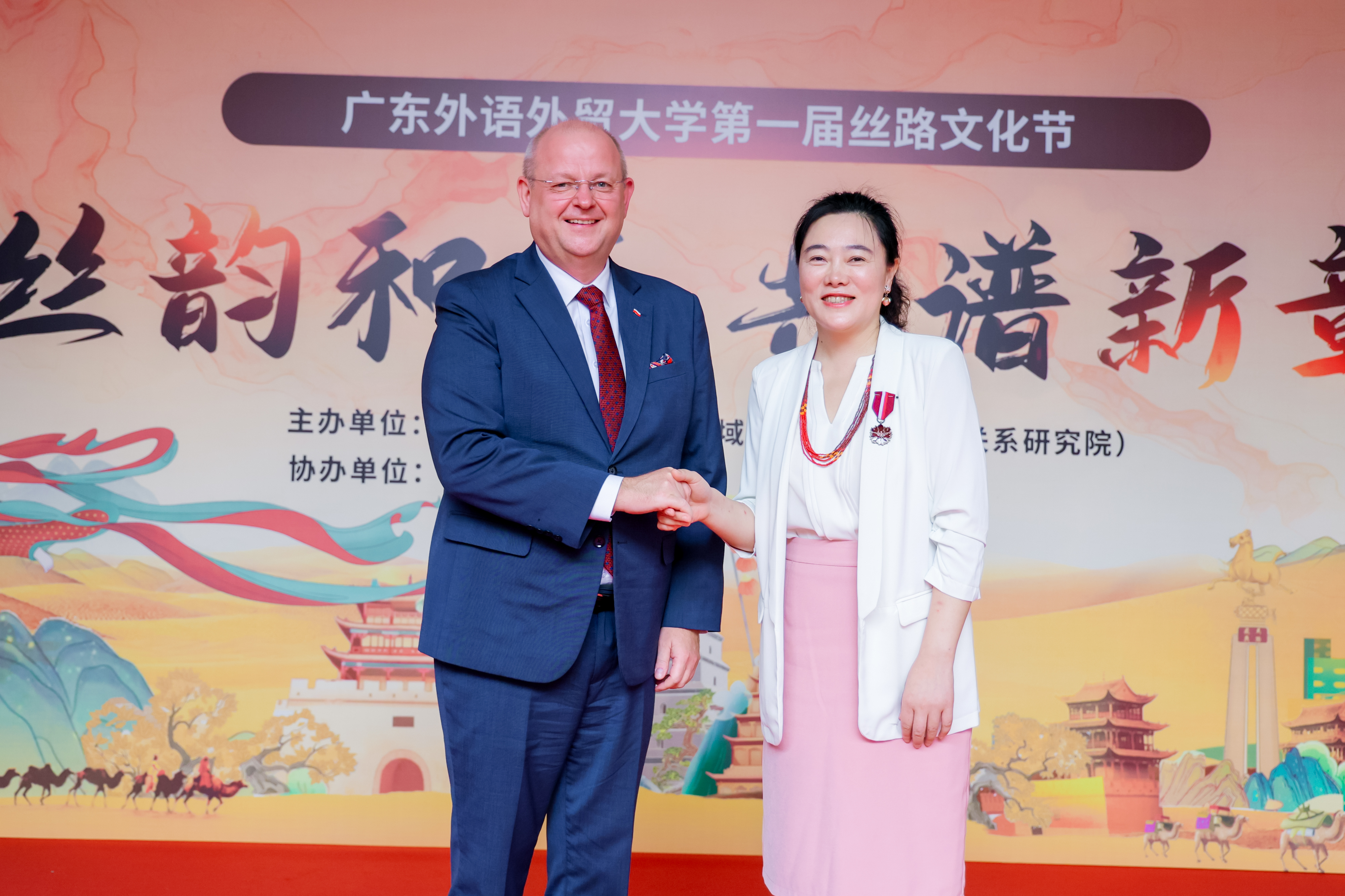 开幕式上,波兰共和国驻广州总领事彼得·诺沃特尼亚克先生代表波兰文化与民族遗产部,向伟德国际betvlctor1946,伟德bv1946官方网站院长茅银辉教授授予象征波兰文化领域最高荣誉的“Gloria Artis”文化功勋奖章,表彰其在推动中波文化交流、增进两国人民相互理解方面做出的卓越贡献。茅银辉在致辞中表示,本次文化节旨在搭建一座文明互鉴的坚实桥梁,通过多元文化的交融碰撞,深化师生对“一带一路”沿线国家的了解。
