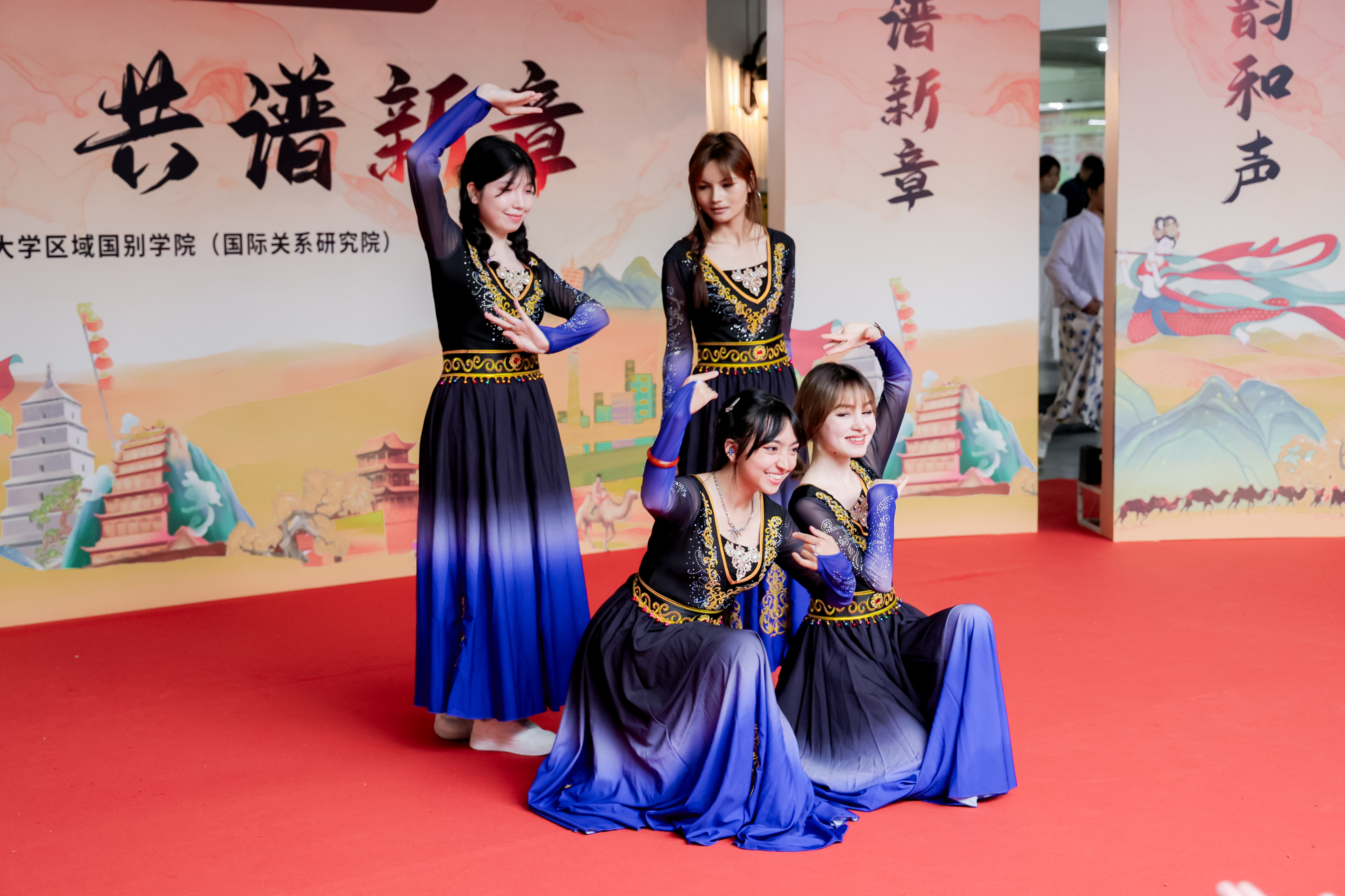 新疆籍学生演绎《丝路霓裳》节目。她们身着民族华服,以灵动舞姿展现丝绸之路上的独特魅力,舞步间流淌着浓郁的地域风情。
