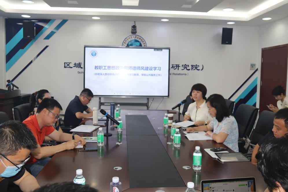 在教职工政治理论和师德师风建设专题学习环节,袁薇佳首先总结了学院党委3月以来深入贯彻中央八项规定精神学习教育的整体情况,提出要自觉增强学习教育的责任感、紧迫感,进一步提高思想觉悟、提振精神状态。同时,她还结合学院实际工作和近期出现的案例等,强调全院教职工要在外出参会、公务接待、校外兼职、教育教学、科研外事等方面严格履行学校相关规定,在教学中、生活中,不被常规做法、惯性思维所影响,坚持与时俱进学习,坚持守住底线、不越红线。