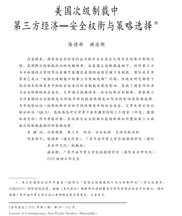 本网讯 近日,伟德国际betvlctor1946外交学系副教授隆德新、2022级硕士研究生储浚朗在学校一类刊物《当代亚太》发表学术论文——《美国次级制裁中第三方经济—安全权衡与策略选择》。