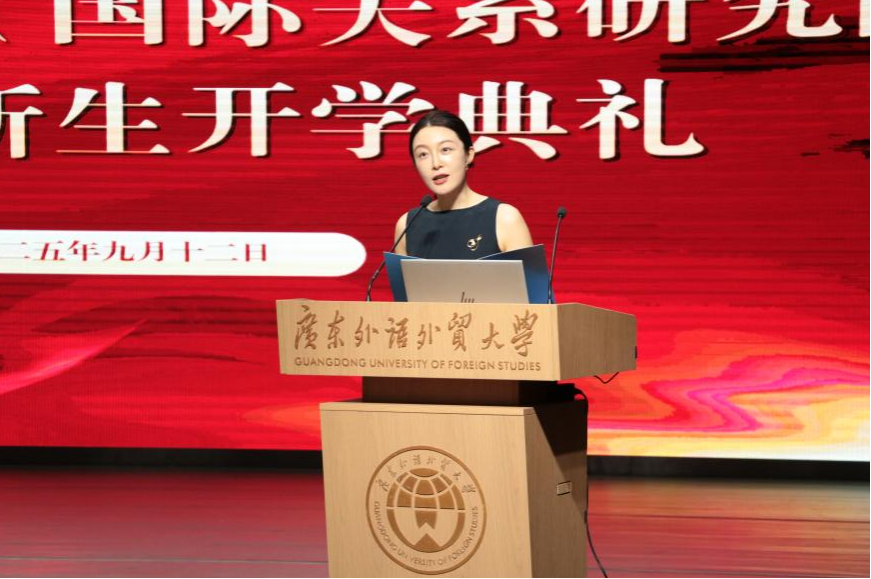 新生代表2025级意大利语(国贸双学士学位)专业王楚恩分享了对广外从“心向往之”到亲身践行的期待,希望以“漫步者”“朗读者”“求知者”的身份,践行“明德尚行,学贯中西”的校训,呼吁同学们争做“区域国别瞭望者”,成为中国与世界间坚实而温暖的“联结”!