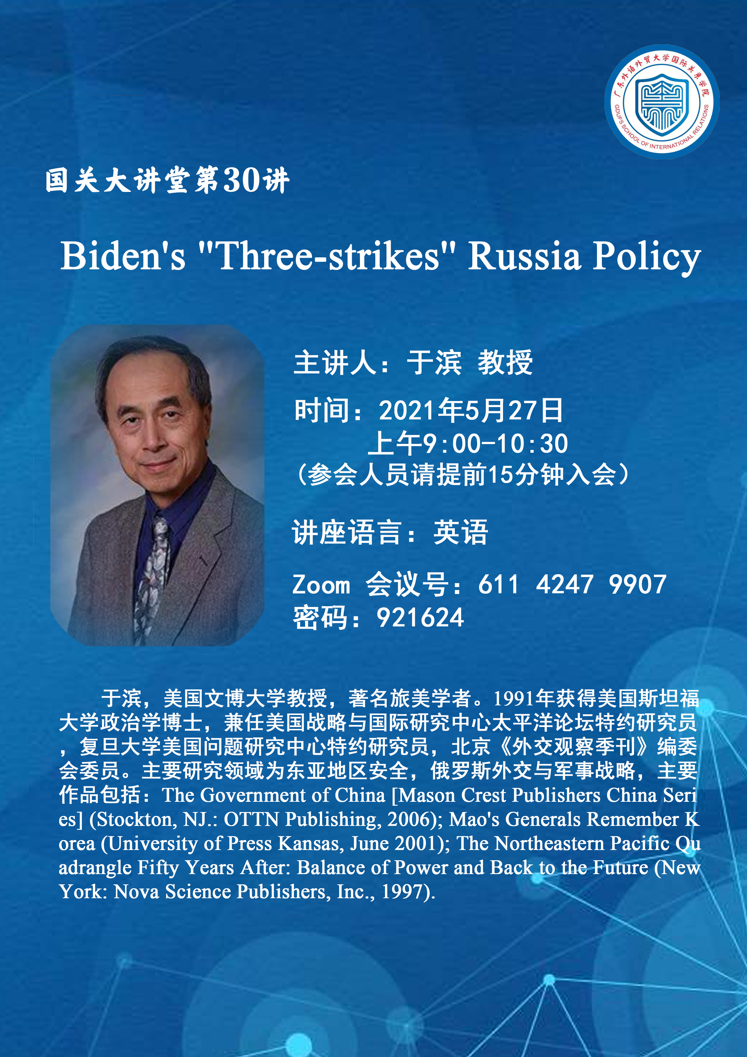 本网讯  2021年5月27日上午,广东外语外贸大学国际关系学院国关大讲堂第30讲顺利举行。 著名旅美学者、美国文博大学政治系教授于滨应邀于线上作题为“Biden’s ‘Three-strikes’ Russia Policy”的学术讲座。本次讲座由国际关系学院副院长吴艳主持,学院院长周方银教授作为嘉宾参与讲座。