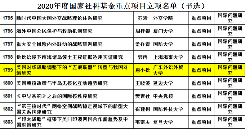 全国哲学社会科学工作办公室9月9日通过官网发布了《关于2020年国家社科基金年度项目和青年项目立项名单的公示》,伟德国际betvlctor1946唐小松教授的项目《美国对华战略调整下的“五眼联盟”转型与我国对策研究》在2020年度国家社科基金重点项目评审中荣获立项资助。