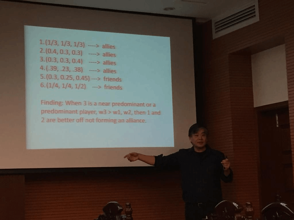 牛铭实教授首先用风趣幽默的语言介绍了自己的研究历程,讲述自己是如何与社会选择理论结缘,又是如何走上国际关系研究的道路,最后形成了自己的三大研究方向,即社会选择理论、选举制度和投票行为、地方治理。他以奥尔森对集体行动的分析和赫舒拉发对竞争行为的分析为基础,展开自己对竞争、联盟行为的分析框架。