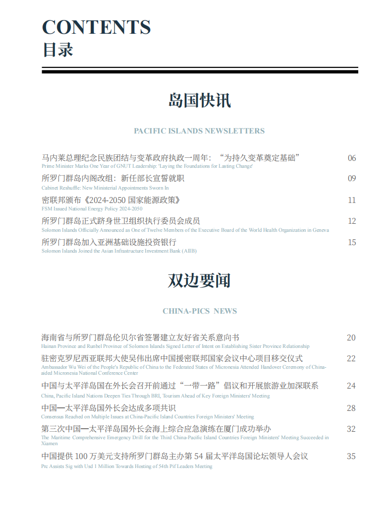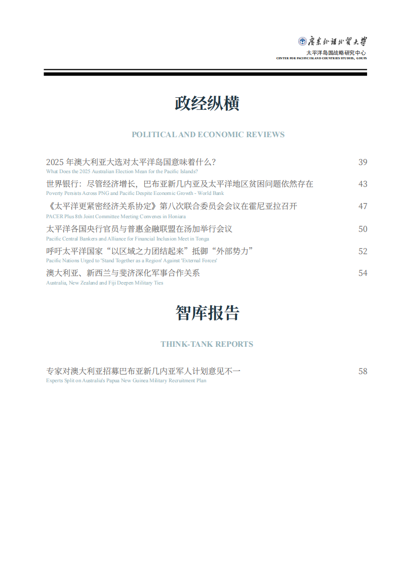 《伟德国际betvlctor1946》是由广东外语外贸大学太平洋岛国战略研究中心编译的学术通讯,旨在为国内外专家、学者,政府部门、研究机构提供太平洋岛国资讯,主要分为岛国快讯、双边要闻、政经纵横、智库报告四个板块。刊物将以双月刊形式进行线上发布。请您查阅2025年第33期内容。