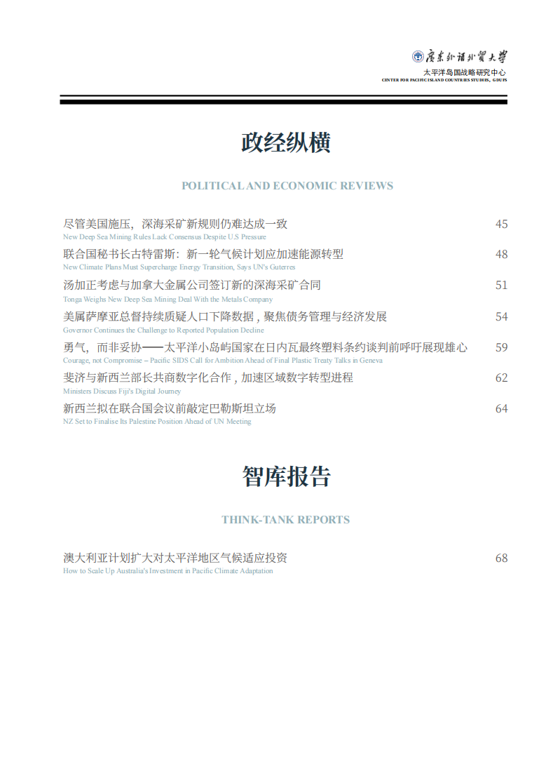 《伟德国际betvlctor1946》是由广东外语外贸大学太平洋岛国战略研究中心编译的学术通讯,旨在为国内外专家、学者,政府部门、研究机构提供太平洋岛国资讯,主要分为岛国快讯、双边要闻、政经纵横、智库报告四个板块。刊物将以双月刊形式进行线上发布。请您查阅2025年第34期内容。