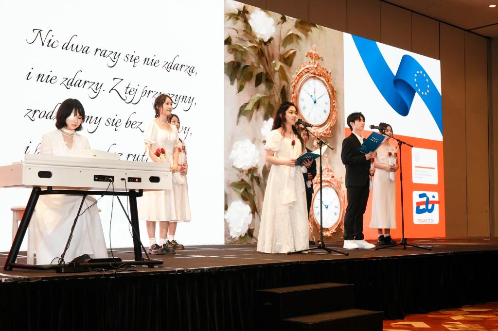 活动伊始,波兰语专业学生精心准备了歌唱表演:第一首改编自波兰诺贝尔奖得主维斯瓦娃·辛波丝卡的诗歌《任何事物都不会发生两次(Nic dwa razy),第二首是波兰爱国歌曲《维斯瓦河在流淌》(Płynie Wisła, płynie)随着悠扬的旋律缓缓流淌,欢快的节奏如鼓点般敲打着心弦,歌声瞬间温暖大堂的每个角落,开启国庆的篇章。