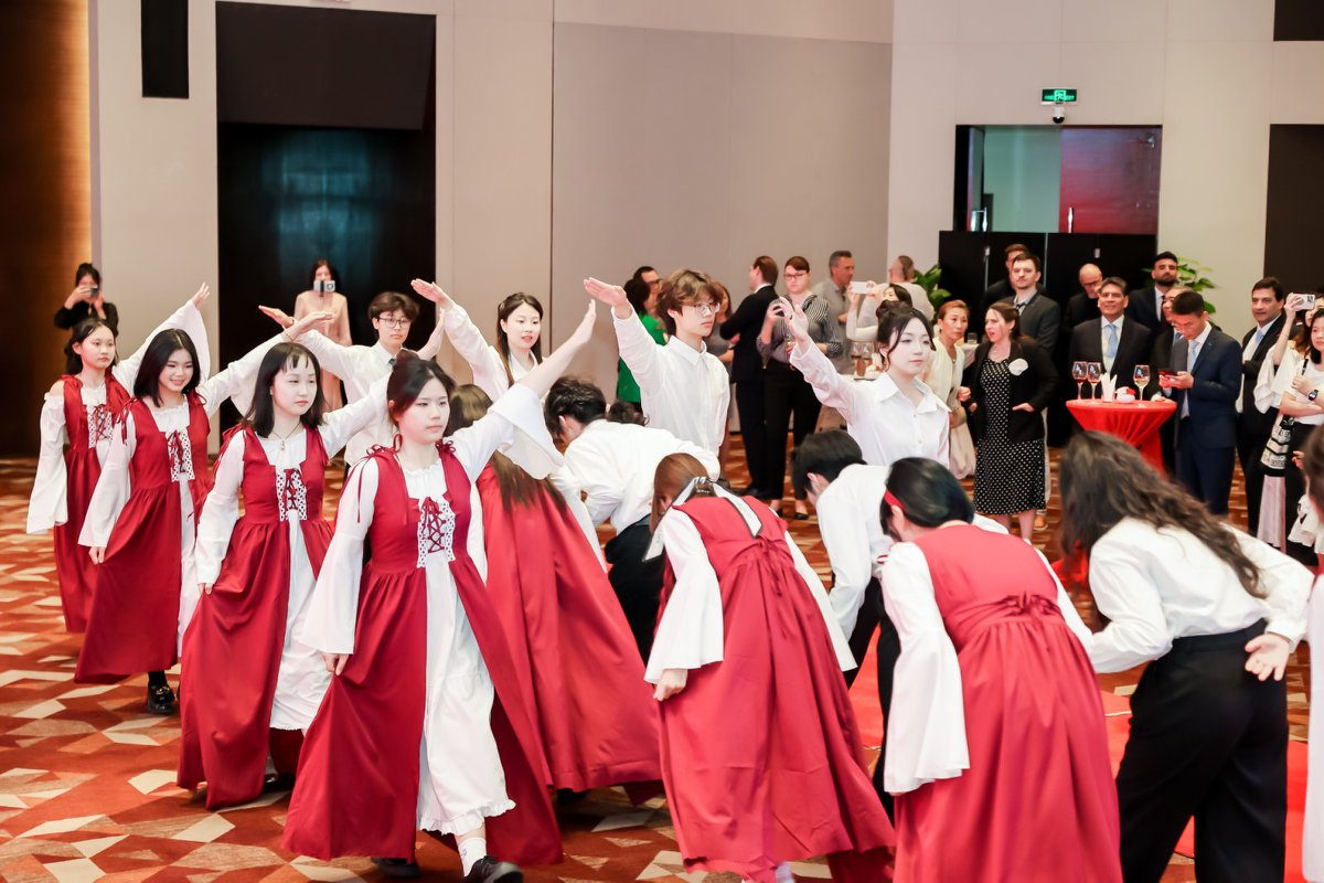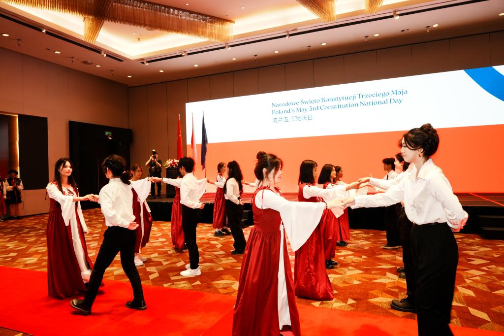 为迎接今年的波兰五三宪法日暨国庆招待会,波兰语系师生还特别准备了一场舞蹈表演。大一和大二学生身着传统服饰,为在场嘉宾呈现了一段极具波兰特色的波罗乃兹舞(polonez)。学生们激情活力的舞步将现场气氛推向了高潮。