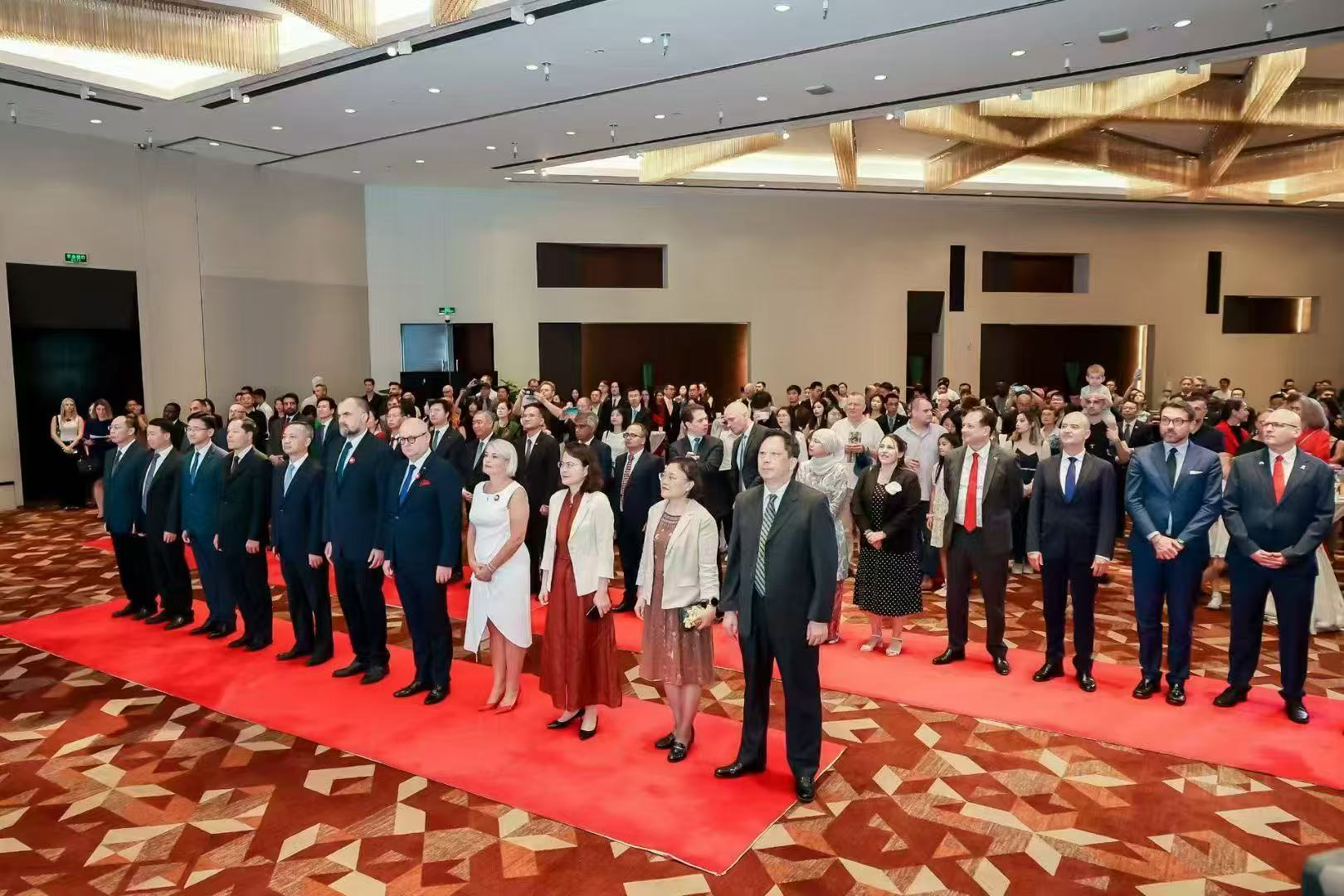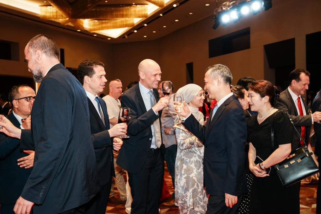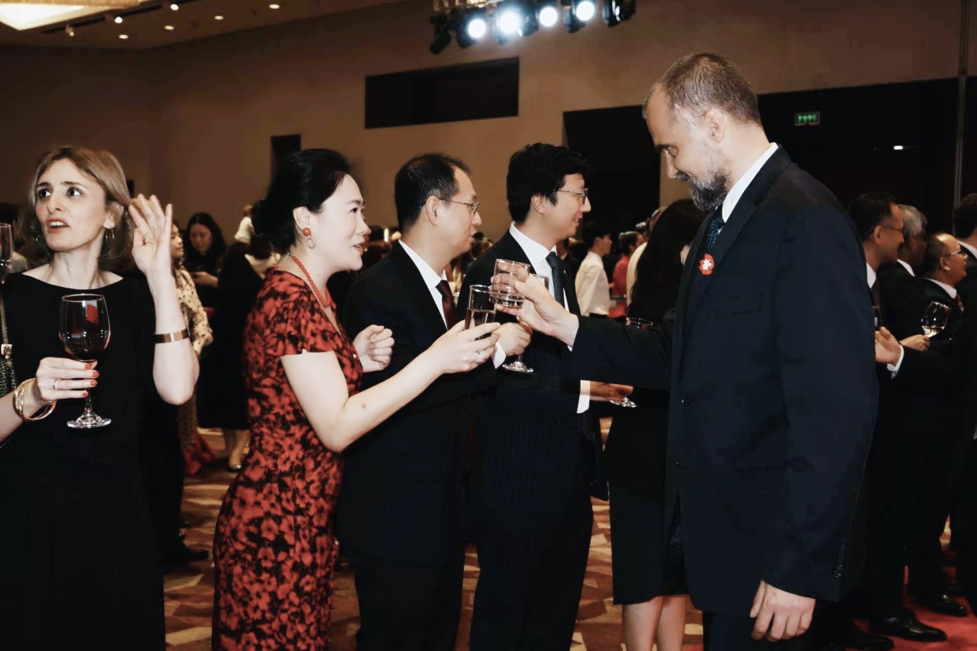 嘉宾致辞结束后,晚宴正式拉开序幕。波兰大使、波兰总领事、张硕辅和李小琴上台,共同举杯庆祝国庆招待会的顺利召开。明浩、茅银辉等也现场嘉宾们热情交谈,表达真挚祝福。
