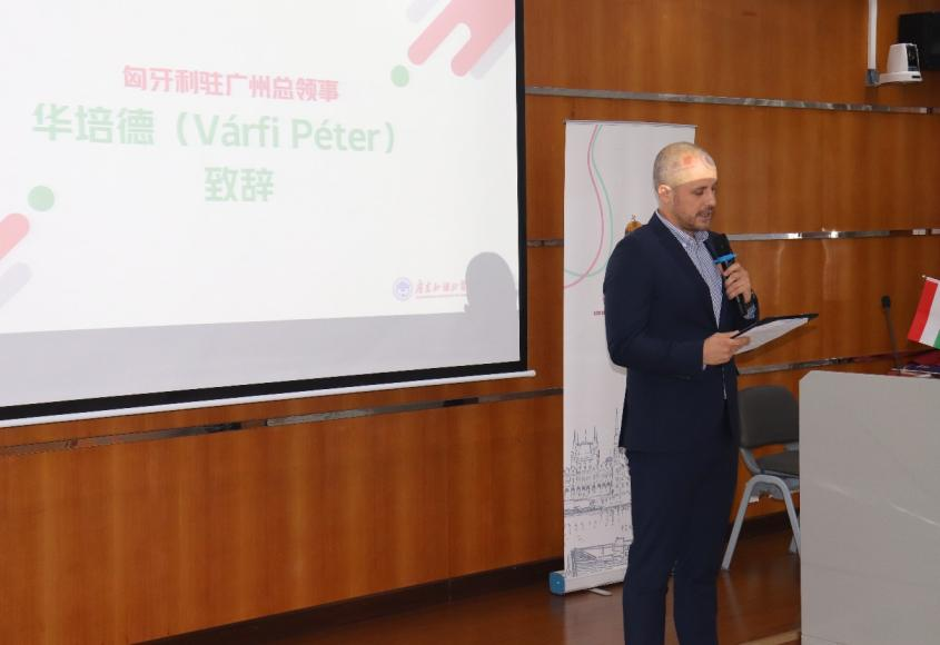 本网讯 4月11日,匈牙利诗歌节暨第一届匈牙利语诗歌朗诵大赛在广外白云山校区第九教学楼丝纺讲堂举行。本次活动由广外伟德国际betvlctor1946,伟德bv1946官方网站主办,匈牙利驻广州总领事馆协办。伟德国际betvlctor1946院长茅银辉教授,匈牙利驻广州总领事华培德(Várfi Péter)、副总领事罗亚当(Róma Ádám),匈牙利语专业全体师生出席本次活动。