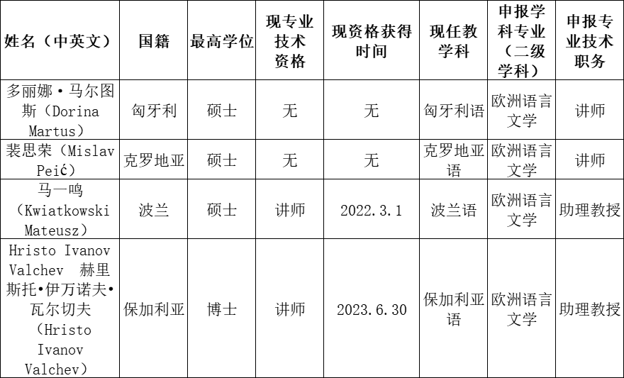 根据广外人〔2025〕9号《关于开展2024年度职称评审及认定工作的通知》、广外人〔2021〕38号《关于修改<广东外语外贸大学职称评审申报条件>和<广东外语外贸大学职称评审“一票申报”清单>的通知》和广外人〔2024〕44号《关于修改《广东外语外贸大学职称评审“一票申报”清单》的通知》要求,学院召开了2024年职称评审资格审查小组会议以及专家推荐小组会议,对申报人的材料进行全面审阅,并进行充分讨论和评议,采取无记名投票方式表决,现拟对推荐评审人员名单予以公示。公示时间从2025年4月7日至4月11日止。